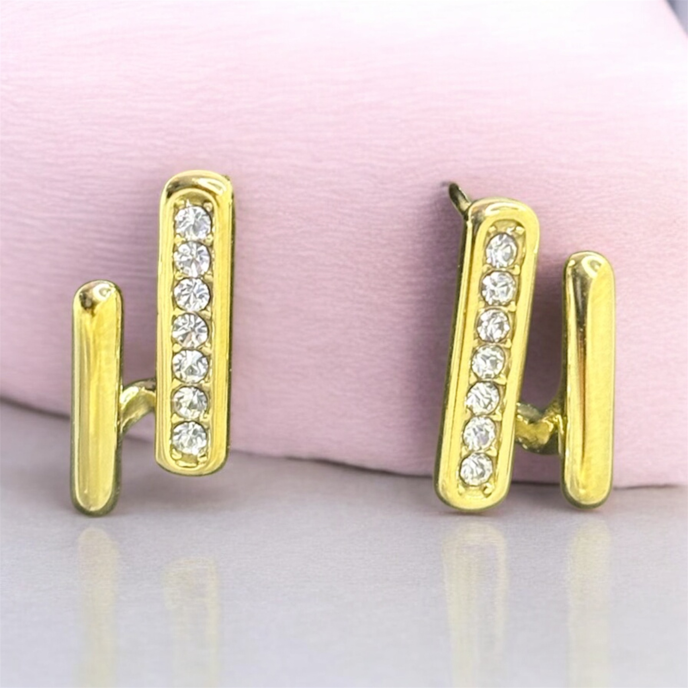 These contemporary bar stud earrings feature a sleek gold-tone finish highlighted by a row of sparkling clear crystals. The minimalist double-bar design creates a subtle statement that feels both modern and timeless. Perfect for everyday wear or layering with other earrings, these studs add just the right touch of elegance and shine.