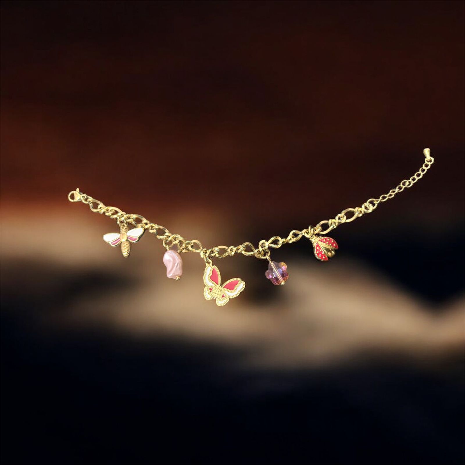 Add a touch of joy and color to your look with this enchanting gold-tone charm bracelet. Featuring delicate butterfly motifs, vibrant enamel details, and dainty gemstone accents, each charm moves gracefully with every gesture, creating a lively and feminine feel.